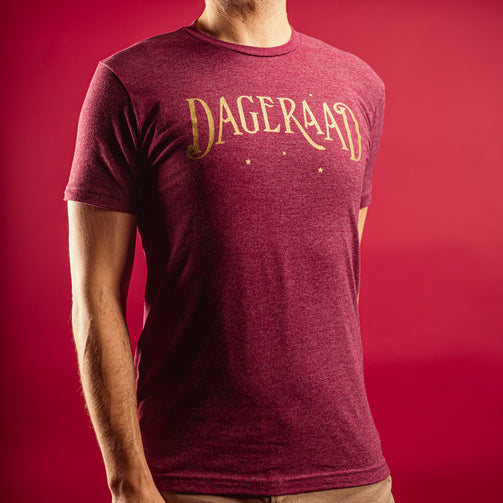 A comfy little shirt featuring the Dageraad logo in gold on a maroon.